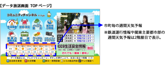 コンテンツはサービスエリアの市町毎の週間天気予報、関東主要都市部の週間天気予報、鉄道運行情報を採用しました。尚、視聴者からのニーズが高まっている地震情報や気象警報などの緊急情報も夏頃に追加する予定であります。