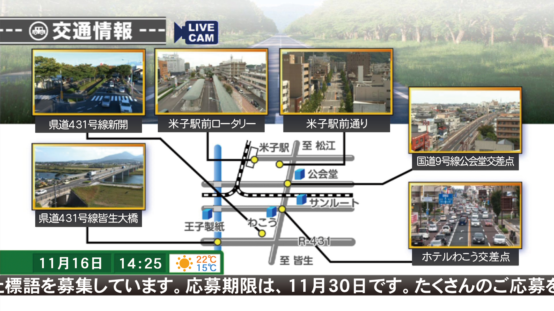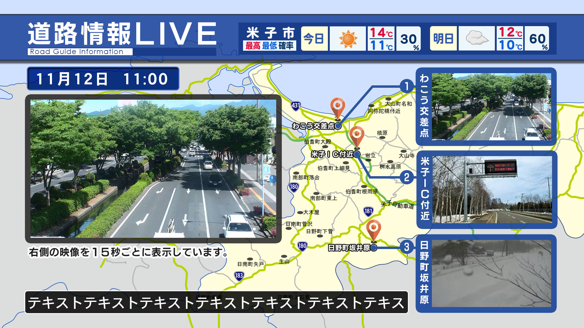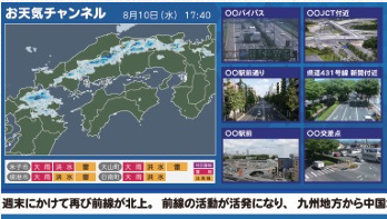 「もしも」の時に視聴者の目となり、地域の「今」を伝えます。カメラ映像の他にも天気予報や 道路・鉄道情報、ニュースなど最新情報も自動表示でき、イベント情報などの文字情報も 組み合わせられるので、地域チャンネルに最適なソリューションです。