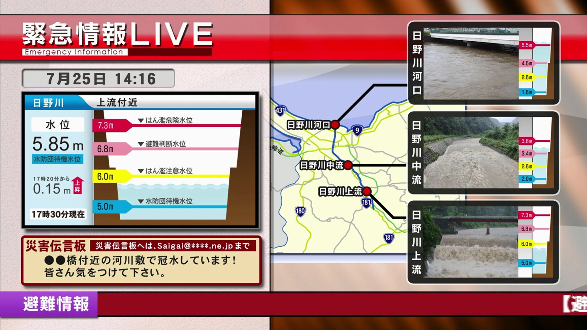 同時に複数の定点カメラの映像を1画面上に表示することで、 地域の状況を瞬時に把握。気象庁や自治体の発表情報を自動更新し、 最新の情報を表示することが可能です。