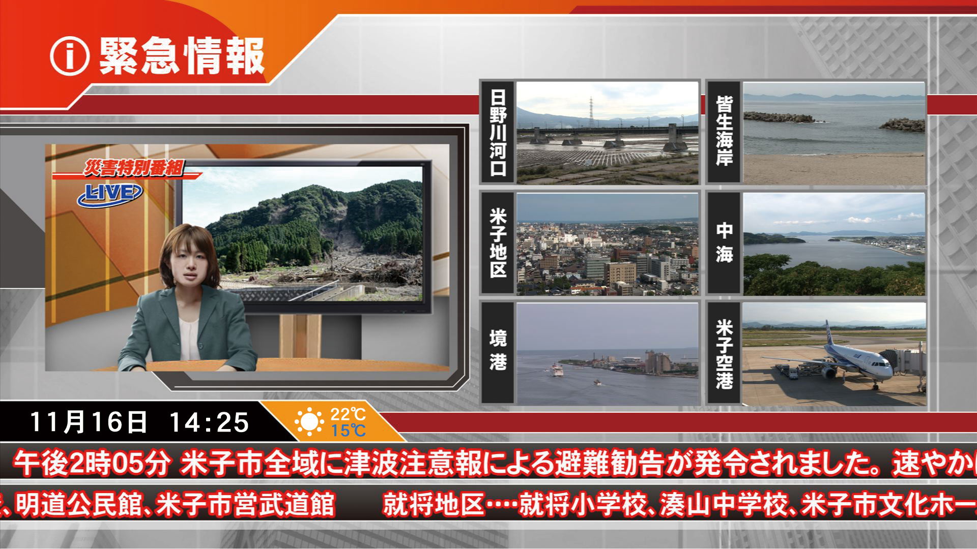 各種レイアウトを編成に従って切り替えながら放送することができます。地震や津波などの緊急情報をトリガーにレイアウトを切り替えることができます。